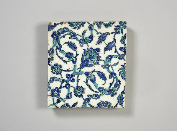 Mattonella rettangolare dipinta in blu e verde su fondo bianco sotto un'invetriatura trasparente. La decorazione della mattonella in esame ruota attorno alla palmetta centrale. Intorno ad essa si sviluppano e si intrecciano rami fioriti e foglie spigate (saz).