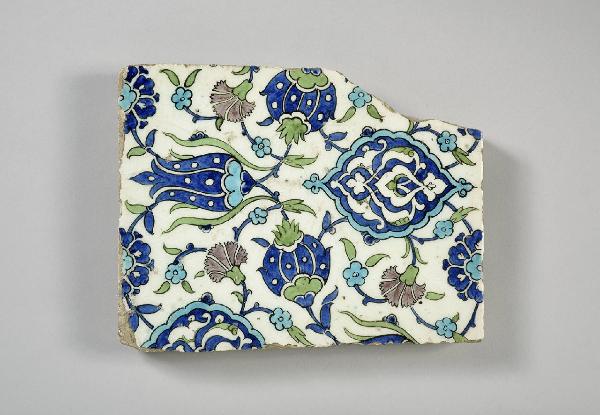 Mattonella quadrangolare, angolo di un pannello, dipinta in blu, turchese, verde e malva su fondo bianco sotto un'invetriatura trasparente. La decorazione consiste in un sottile bordo con disegni di arabeschi e gigli stilizzati separato mediante una striscia turchese dal resto della mattonella che risulta è ornata da un elegante medaglione polilobato dalla forma allungata decorato con lo stesso motivo del bordo. Inoltre, fanno da sfondo garofani, tralci fioriti, porzioni di tulipani e grossi boccioli. \nPer la decorazione il presente manufatto può essere messo in relazione con le mattonelle n. 107 A e 107 B, 127, 128 e 170; lievi differenze nell'uso dei colori.