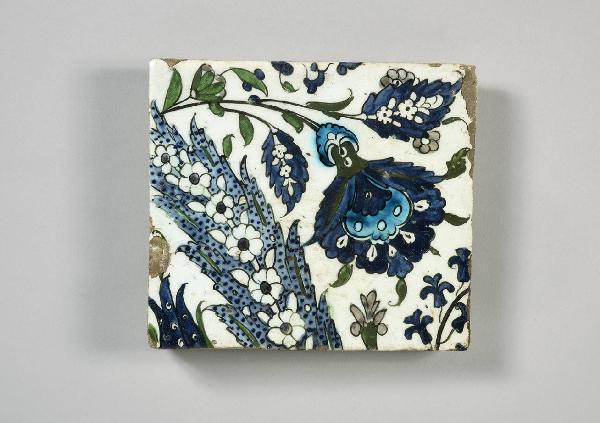 Mattonella di forma quadrata dipinta in blu, verde, turchese, malva e bianco sotto invetriatura trasparente. La decorazione consiste di una grande e carnosa palmetta centrale affiancata da rami fioriti e fogliati. In un angolo si osserva la porzione di un tulipano e una grande foglia dal profilo seghettato ornata con fiorellini bianchi a risparmio.