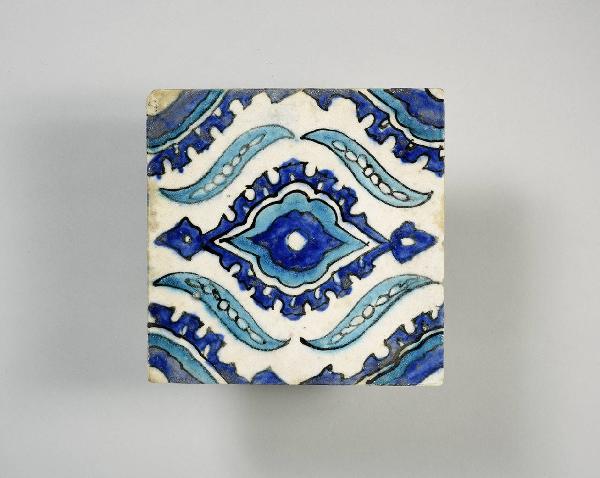 Mattonella di forma quadrata dipinta in blu, turchese, nero e bianco sotto invetriatura trasparente. La decorazione consiste in un grande medaglione centrale ornato da forme ovali polilobate e concentriche e incorniciato da foglie curvilinee. Negli angoli sono presenti quarti di medaglione.