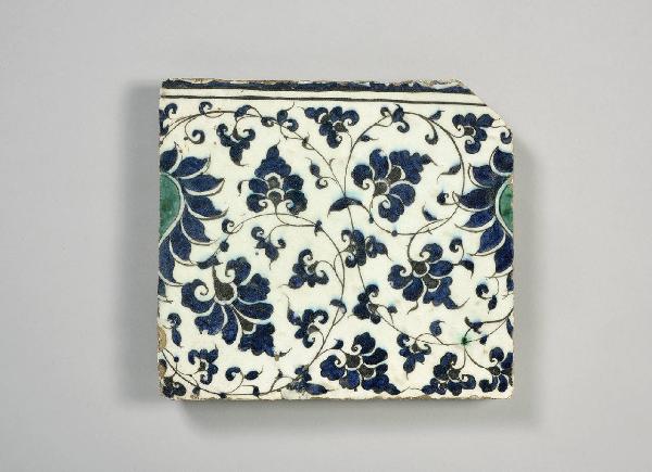 Mattonella quadrangolare da rivestimento parietale decorata da un elegante motivo spirali filiformi recanti foglie e inflorescenze blu su fondo bianco. Ai lati due porzioni di un disegno floreale. Questo tipo di decorazione potrebbe derivare da modelli siriani del XV secolo i quali, a loro volta, sembrano rifarsi a prototipi cinesi.