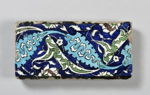 Mattonella rettangolare sicuramente parte della cornice di un pannello. Sul fondo blu si distinguono foglie spigate (saz) dipinte in turchese e arricchite da un motivo a nastri (chi-chi) di origine cinese. Sulla rimanente porzione insistono palmette e rosette a risparmio e dipinte in verde salvia e malva con profilo nero. \nI colori sono tipici delle mattonelle prodotte a Damasco nella seconda metà del XVI secolo. \nMattonella pressoché identica sia nella decorazione sia nelle dimensioni (29 x 14 cm.) sono presenti nel catalogo d'asta Sotheby's (aste londinesi del 12 ottobre 1988 e del 25 aprile 1990) con la medesima attribuzione e datazione.\nLa presente mattonella è entrata a far parte delle collezioni museali come proveniente dall'Anatolia e con una datazione posticipata al XVII secolo.