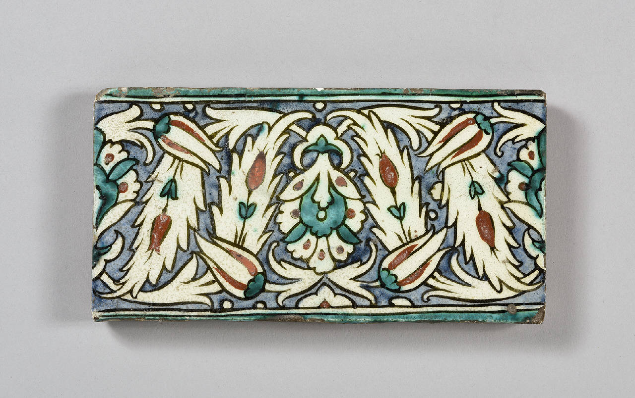 Mattonella di forma rettangolare, parte della cornice di un pannello dipinta in azzurro, verde, rosso e bainco sotto un'invetriatura trasparente. La decorazione, un motivo ripetuto, consiste in una palmetta centrale racchiusa da quattro tulipani sovrapposti a foglie spigate (saz). \nSimile alla mattonella inv. n. ISL 189.
