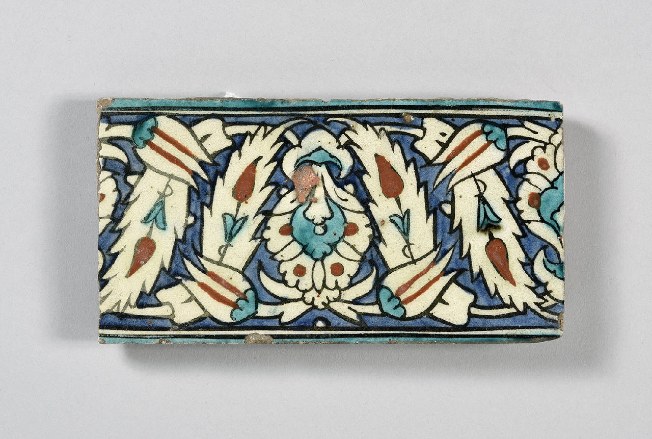 Mattonella di forma rettangolare, parte della cornice di un pannello dipinta in azzurro, verde, rosso e bainco sotto un'invetriatura trasparente. La decorazione, un motivo ripetuto, consiste in una palmetta centrale racchiusa da quattro tulipani sovrapposti a foglie spigate (saz). \nSimile alla mattonella inv. n. ISL 189.