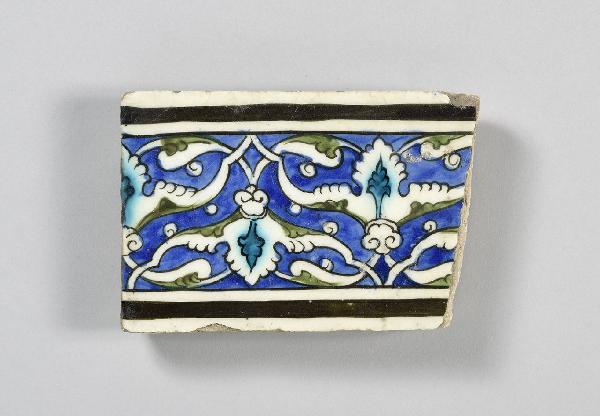 Mattonella di forma rettangolare, parte della cornice di un pannello, dipinta in blu cobalto, verde oliva, turchese, nero e bianco sotto un'invetriatura trasparente. La decorazione consiste in un disegno ripetuto di semipalmette e arabeschi. Il disegno sembra derivare dalle mattonelle prodotte a Iznik (ca. 1575 - 1590) per la moschea di Rustem Pasha.\nSimile alla mattonella, inv. ISL 192.