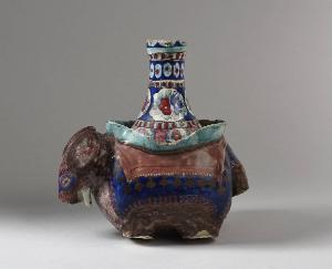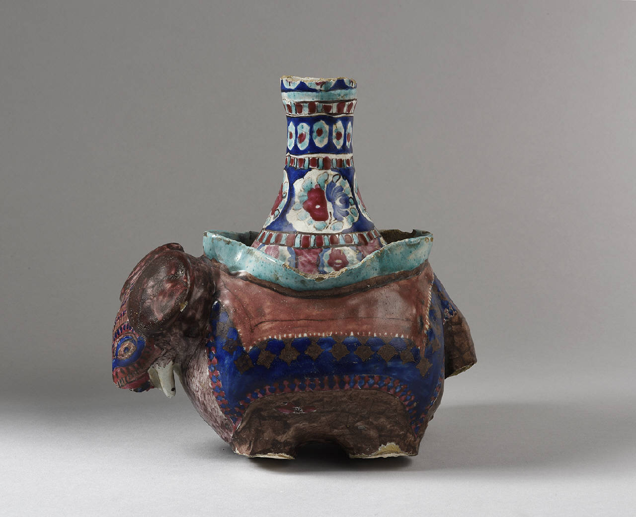 Basamento di una pipa ad acqua modellata a forma di elefante. La base è dipinta in marrone, blu, verde, rosso. Il manufatto in esame potrebbe essere ricondotto, seppur in via dubitativa, all'area anatolica.\nOggetti in ceramica modellati a forma di animali sono piuttosto comuni nel mondo islamico. La loro funzione era spesso legata all'acqua, come brocche, ma anche elementi e getti di fontana, utensili per il bagno turco (hammam).