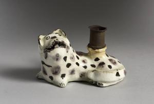 Basamento di una pipa ad acqua modellata a forma di tigre accovacciata e maculata dipinta in grigio e bianco sotto invetriatura trasparente. Sul foro di fissaggio del tubicino per l'aspirazione del tabacco è stato fissato un cilindro metallico che da trasformato l'oggetto in esame in un portacandele. \nOggetti in ceramica modellati a forma di animali sono piuttosto comuni nel mondo islamico. La loro funzione era spesso legata all'acqua, come brocche, ma anche elementi e getti di fontana, utensili per il bagno turco (hammam). Il manufatto è stato attribuito all'area anatolica ma non va esclusa una provenienza dall'area persiana.\nDi provenienza turca è probabilmente un portacandele già alle origini.