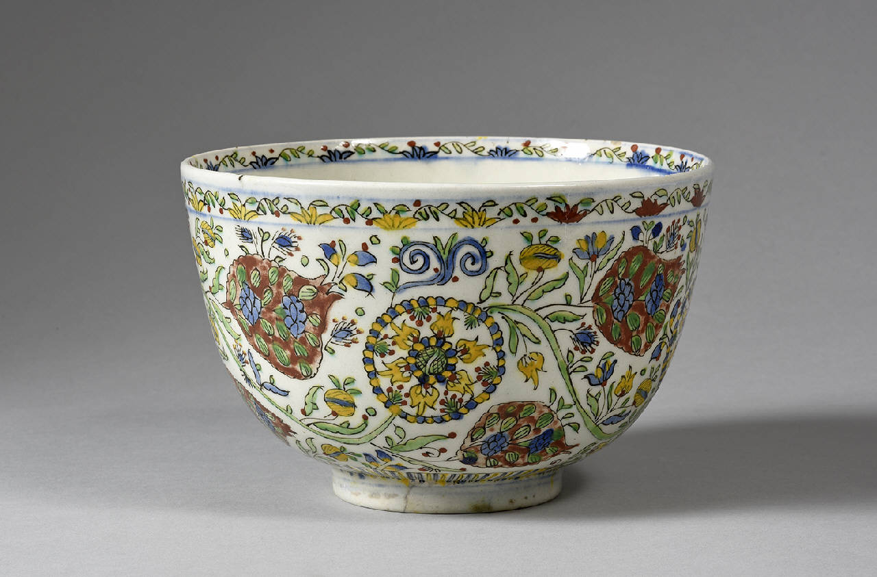 Coppa decorata in rosso, giallo, verde, blu su fondo bianco. L'ornato della coppa è costituito da motivi floreali e vegetali. \nEntrata a far parte delle collezioni museali milanesi come porcellana persiana, l'oggetto in esame è attribuibile alle manifatture di Kütahya (Asia minore occidentale), il centro ceramico più importante dopo Iznik, del quale divenne erede nel Settecento.