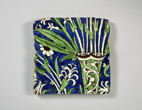 Mattonella quadrangolare dipinta in blu cobalto, verde, marrone e bianco sotto un'invetriatura trasparente. La decorazione comprende il collo di un vaso di fiori decorato ad arabeschi e contenente mazzi di fiori (probabilmente tulipani). A lato rametti fogliati e gigli. \nMattonelle con queste caratteristiche cromatiche e stilistiche sono spesso presenti sul mercato antiquariale internazionale.