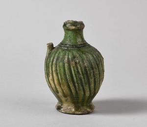 Vaso di ceramica invetriata con il corpo ornato da elementari motivi obliqui a nervatura. Le nervature del vaso potrebbero essere fatte con uno stampo considerata la loro regolarità. Manca il manico.