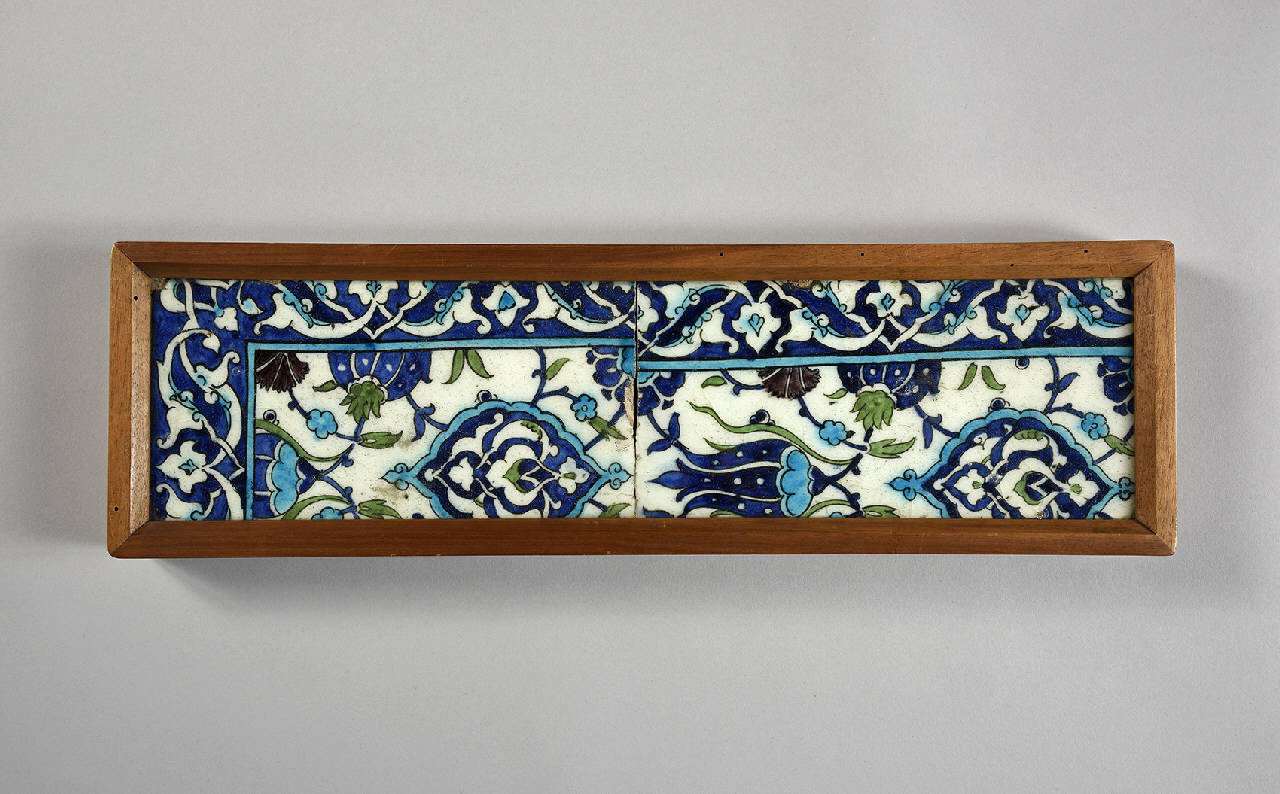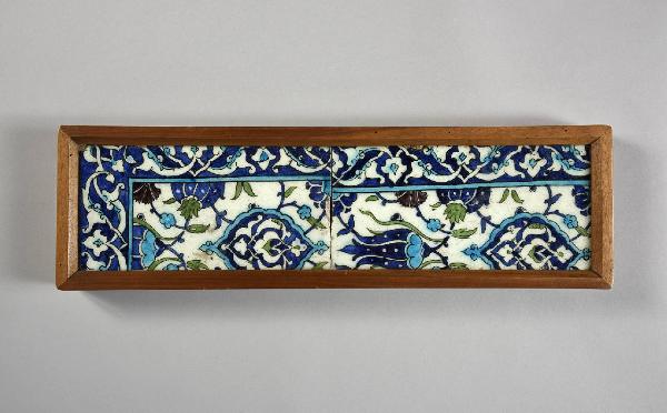 Pannello decorativo costituito dall'aggregazione di due mattonelle rettangolari entro cornice lignea.