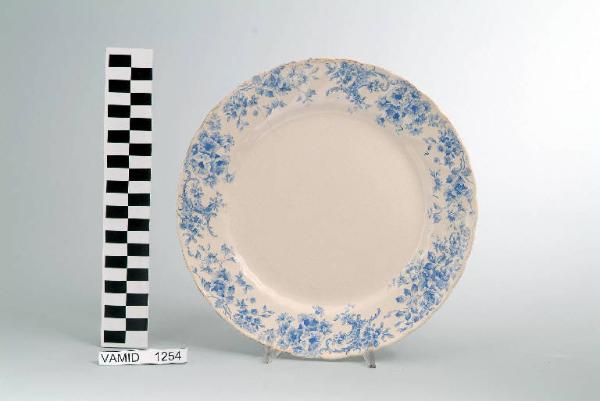 Piatto piano di colore avorio. Decorazione con motivo a rocailles e fiori in blu sulla tesa.