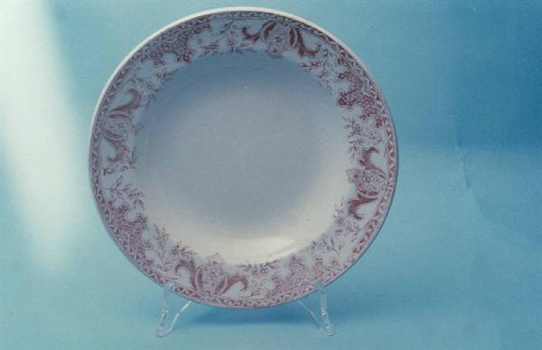 Piatto fondo color avorio di forma circolare; decorazione con motivo floreale in decalcomania rossa sulla tesa.