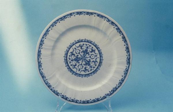 Piatto piano di colore avorio con bordo sagomato a rilievo. Decorazione con motivi vegetali stilizzati in decalcomania blu al centro e sul bordo della tesa.