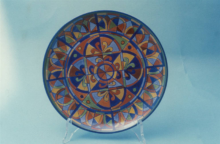 Piatto piano di forma circolare; decorato con motivi astratti nei colori arancio, verde, blu, azzurro, marrone e giallo.