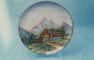Piatto piano di forma circolare; decorato a mano con paesaggio montano in azzurro, rosa, grigio, verde, marrone e giallo.