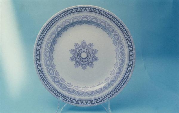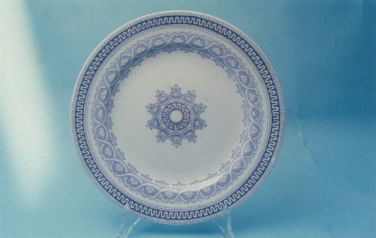 Piatto piano di colore avorio di forma circolare; decorato in decalcomania blu con motivi geometrici e vegetali al centro e sulla tesa.