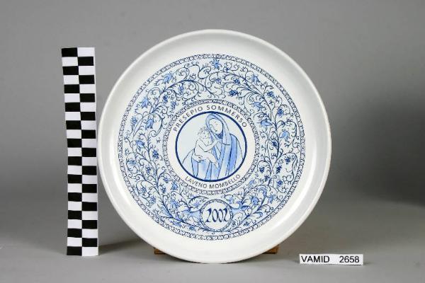 Piatto privo di tesa con largo cavetto. Sul fondo scena figurativa entro clipeo circolare ornato di incorniciatura a racemi in colore blu.