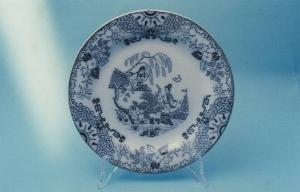 Piatto piano circolare; fondo bianco con paesaggio giapponese nel cavetto; motivi vegetali e geometrici lungo l'ala.