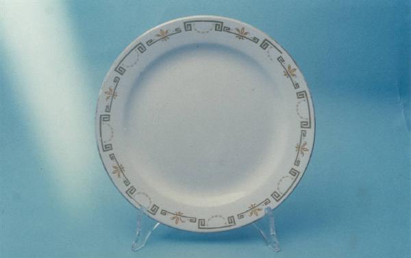 Piatto da frutta circolare; fondo bianco con motivi decorativi neoclassici lungo l'ala; bordo rifinito con filettatura oro.