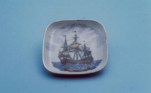 Posacenere di forma quadrata; fondo bianco con veliero danese policromo al centro; angoli arrotondati; bordo rifinito con filettatura oro.