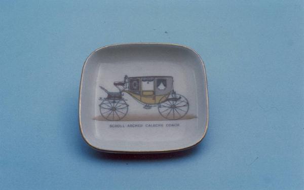 Posacenere di forma quadrata; fondo bianco con carrozza policroma al centro; angoli arrotondati; bordo rifinito con filettatura oro.
