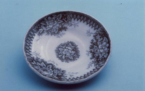 - NOTIZIE STORICO CRITICHE Il confronto stilistico con oggetti della stessa manifattura aventi il medesimo motivo floreale con greca a rombi porta a datare il piattino alla seconda metà dell'Ottocento (cfr. nn. inv. 2067, 2068, 2107). Tale decoro, realizzato con la tecnica della decalcomania in monocromo nero, si ritrova anche in produzioni della SCI databili tra il 1880 e il 1900 (cfr. "La terraglia italiana", p. 168). E' possibile che la scritta presente nel marchio, oggi solo parzialmente leggibile, indichi il tipo di decoro.