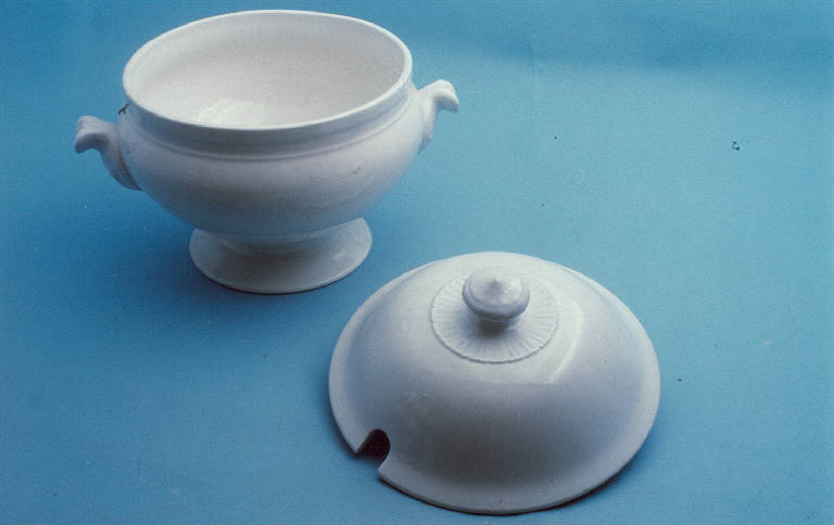 Zuppiera di forma circolare con manici a ricciolo; piede estroflesso; coperchio di forma circolare con rientranza su un lato per l'appoggio del mestolo e pomolo sommitale; fondo bianco.
