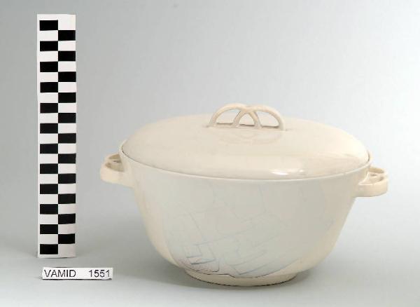 Zuppiera con recipiente a forma di grande ciotola; fondo bianco con motivi decorativi geometrici coperti da vernice; manici e presa apicale a forma di semicerchi incrociati; coperchio circolare.