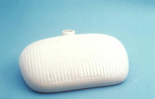 Contenitore allungato con piccola brocca a metà della lunghezza, decorato con motivo a coste verticali a rilievo; fondo bianco.