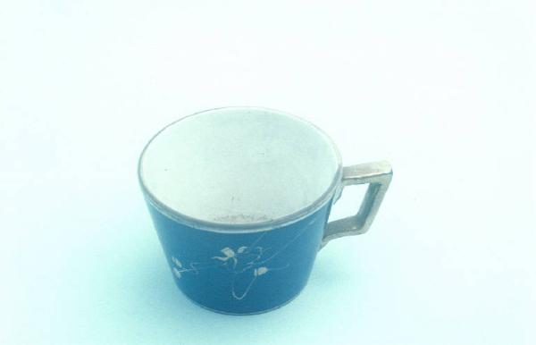- NOTIZIE STORICO CRITICHE La mancanza del marchio impedisce di risalire con esattezza alla ditta produttrice. L'oggetto è comunque attribuibile ad una generica manifattura lavenese. Il confronto stilistico con un servizio da thè prodotto dalla S.C.I. e dipinto su disegno di Luigi Reggiori tra gli anni '20 e '30 del Novecento (cfr. "La terraglia italiana", p. 177) ipotizza una datazione entro il primo quarto del secolo. La coloritura blu cobalto e il motivo floreale sono eseguiti sottosmalto. Nel Museo delle Terraglie di Laveno sono conservate altre due tazze simili (cfr. nn. inv. 1580, 1581).