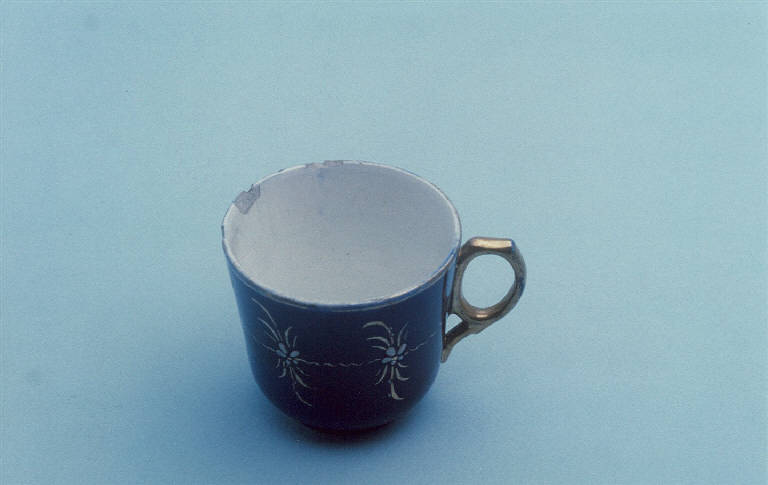 - NOTIZIE STORICO CRITICHE La mancanza del marchio impedisce di risalire con esattezza alla ditta produttrice. L'oggetto è comunque attribuibile ad una generica manifattura lavenese. La tipologia del vasellame in questione, ampiamente diffusa tra la fine dell'Ottocento e l'inizio del secolo successivo e riscontrabile in un servizio da caffè (nn. inv. 2001-2018) prodotto dalla S.C.I. in quegli anni, viene ripresa nei primi decenni del Novecento. Il decoro naturalistico stilizzato della tazza indica una datazione entro il primo quarto del secolo. La coloritura blu cobalto è eseguita sottosmalto, i fiori sono in parte e rilievo.