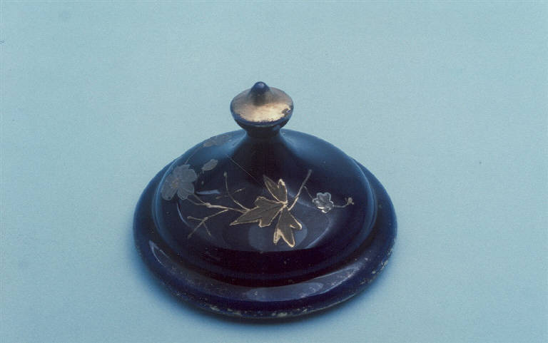 Coperchio circolare; decoro con disegni floreali in argento e oro su fondo blu cobalto; bordi e manico apicale in oro.