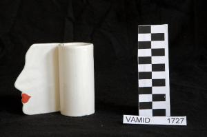 Portapenne formato da recipiente a forma cilindrica avente un prolungamento laterale ad aletta terminante con profilo di volto umano; fondo bianco uniforme con bocca dipinta di rosso.