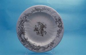- NOTIZIE STORICO CRITICHE Il piatto è decorato a decalcomania sottosmalto con disegno di tipo neorococò, caratterizzato da un fantasioso svolgersi di motivi naturalistici e artistici disposti secondo un andamento sinuoso che trova rispondenza nei rilievi a "S" del piatto. Il revival dello stile rococò ebbe il suo apice negli anni '70 dell'Ottocento.