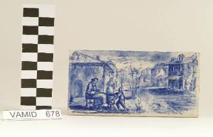 Piastrella rettangolare; fondo bianco con veduta di paese in blu.