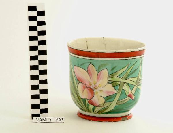Vaso con piede circolare; fondo bianco avorio decorato con fiori in verde, azzurro, rosa e giallo; piede e bordo superiore in rosso.