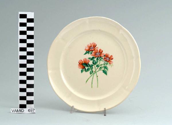 Piatto piano con orlo ondulato; fondo bianco avorio con motivo floreale dipinto a mano in verde, rosa, viola e marrone al centro del cavetto