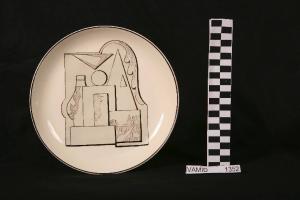 - NOTIZIE STORICO CRITICHE Il piatto, dipinto a mano, fu eseguito nell'ambito delle "esercitazioni" che si svolgevano nella Scuola per Ceramisti di Laveno, istituita nel 1950 e chiusa nel 1963. Gli insegnamenti avevano luogo nei locali della Società Ceramica Italiana ed erano gestiti dalla società stessa. Sotto il piede compare la firma dell'allievo che eseguì il piatto (Brunella D.). Nel Museo di Laveno sono conservati altri pezzi simili (nn. inv. 1347, 1349-1351, 1353-1366).