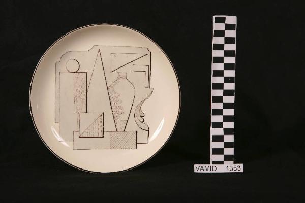 Piatto piano di forma circolare; fondo bianco avorio con motivi decorativi geometrici in monocromo grigio nel cavetto; bordo rifinito in nero.
