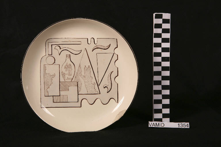 - NOTIZIE STORICO CRITICHE Il piatto, dipinto a mano, fu eseguito nell'ambito delle "esercitazioni" che si svolgevano nella Scuola per Ceramisti di Laveno, istituita nel 1950 e chiusa nel 1963. Gli insegnamenti avevano luogo nei locali della Società Ceramica Italiana ed erano gestiti dalla società stessa. Sotto il piede compaiono la data e la firma dell'allievo che eseguì il piatto (Cadario Luigi G.). Nel Museo di Laveno sono conservati altri pezzi simili (nn. inv. 1347, 1349-1353, 1355-1366).