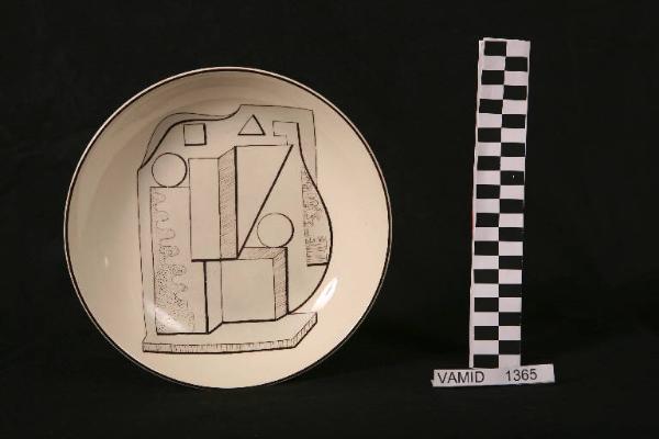 - NOTIZIE STORICO CRITICHE Il piatto, dipinto a mano, fu eseguito nell'ambito delle "esercitazioni" che si svolgevano nella Scuola per Ceramisti di Laveno, istituita nel 1950 e chiusa nel 1963. Gli insegnamenti avevano luogo nei locali della Società Ceramica Italiana ed erano gestiti dalla società stessa. Sotto il piede compaiono la data e la firma dell'allievo che eseguì il piatto (Ielmini Luciano). Nel Museo di Laveno sono conservati altri pezzi simili (nn. inv. 1347, 1349-1364, 1366).