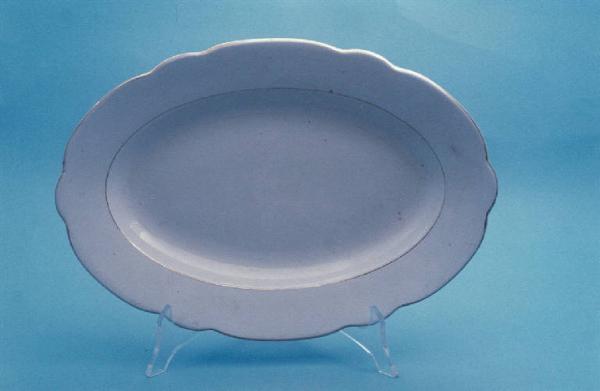 - NOTIZIE STORICO CRITICHE L'oggetto in esame rientra in una tipologia di vasellame di gusto popolare. Il design sobrio ed elegante, una linea ondulata e il bordo sottolineato da leggere profilature in oro che si stagliano sul fondo bianco avorio della terraglia indicano una datazione alla prima metà del Novecento. La mancanza di caratteri stilistici particolari impedisce una definizione cronologica più circoscritta. Il piatto fa parte di una donazione fatta al museo nel 1995.