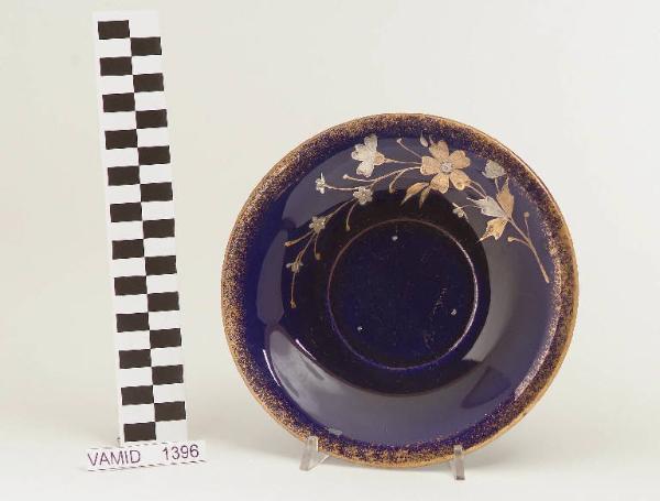 Piattino di forma circolare fondo blu cobalto; decoro con disegni floreali in argento e oro in posizione decentrata; bordo rifnito con filettatura oro e motivo a spruzzo.