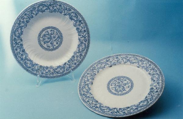 Il servizio è composto da due piatti con bordo sagomato a rilievo; fondo bianco e motivi decorativi vegetali in blu lungo la tesa e nel centro del cavetto.