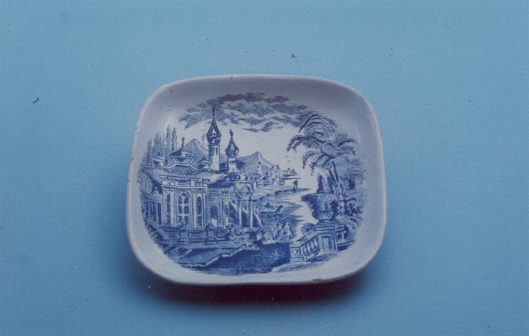 - NOTIZIE STORICO CRITICHE La mancanza del marchio impedisce di risalire con esattezza alla ditta produttrice. L'oggetto, comunque attribuibile ad una generica manifattura lavenese, è riferibile ad una produzione di metà Novecento che ha ormai assimilato la lezione del funzionalismo. La forma quadrata, arrotondata negli angoli, sobria ed elegante denota una ricerca stilistica. Il paesaggio indo-cinese in esame con palazzo e giardino davanti a un golfo marino con monti sullo sfondo è una variante di quel decoro denominato "Bosphorus" nato in Inghilterra e riprodotto da manifatture inglesi ed europee.