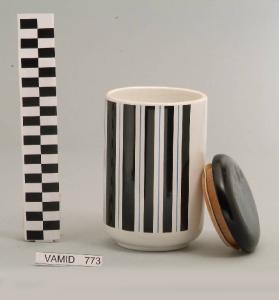 Barattolo cilindrico; fondo bianco con motivo a strisce verticali in nero e azzurro; coperchio ligneo circolare.