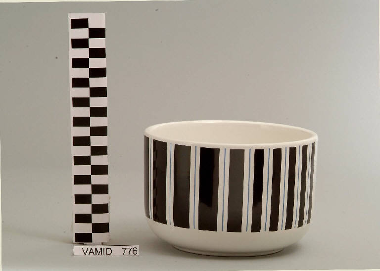 - NOTIZIE STORICO CRITICHE Il design essenziale e funzionale della biscottiera, appartenente ad un servizio da thè (nn. inv. 776, 780-781), indica una datazione ormai avanzata nel Novecento. Come riporta il Peregalli, è riferibile alla produzione di Albino Reggiori. L'artista lavenese cominciò a fare ceramica nel 1955 ma fu dopo il 1981 che la sua ricerca si sviluppò prevalentemente nel campo ceramistico, in modo particolare sui materiali ceramici legati alla propria terra. Tipologicamente l'oggetto in esame si lega ad un servizio da tavola (nn. inv. 773...783) e ad un servizio da caffè (nn. inv. 775, 778-779) conservati nel Museo delle Terraglie di Laveno. Il decoro è stato realizzato con la tecnica della decalcomania sottosmalto.
