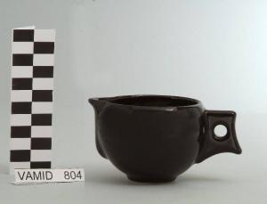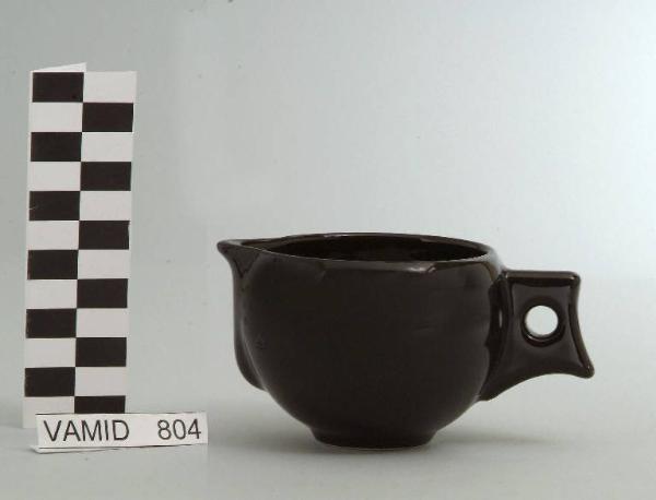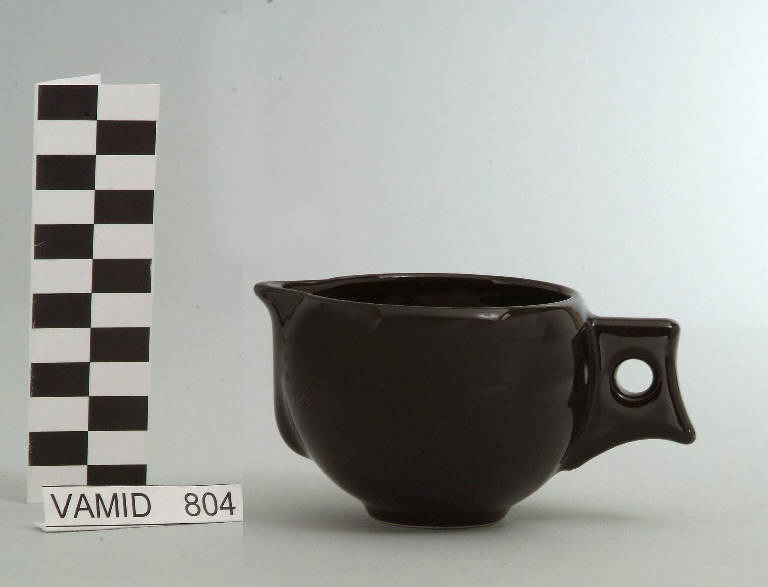 Lattiera con corpo sferico; manico squadrato; beccuccio sporgente; fondo nero.