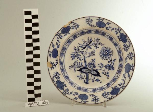 - NOTIZIE STORICO CRITICHE Il piatto fondo, appartenente ad un servizio composto da tre elementi (nn. inv. 404, 656-657), è decorato a transfer sottosmalto con un motivo bu cobalto denominato "Meissen". Il marchio presente a tergo venne impresso su tutte le terraglie prodotte dalla Richard Ginori nello stabilimento di San Cristoforo indicativamente dal 1883 al 1960. Il confronto stilistico con un servizio da tavola realizzato nella forma "Vecchia Milano" da Guido Andlovitz in collaborazione con la S.C.I. nel 1929 ha permesso di ipotizzare una datazione tra gli anni '20 e '30 del Novecento. Nel museo di Laveno sono conservati altri due piatti con il medesimo decoro prodotti dalla S.C.I. nel 1924 e nel 1925 (nn. inv. 401-402).